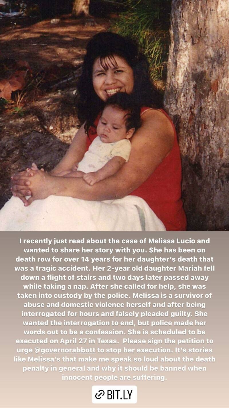 "Por favor firmen la petición para instar al gobernador Greg Abbott a detener su ejecución. Son historias como las de Melissa las que me hacen hablar tan alto sobre la pena de muerte en general y por qué debería prohibirse cuando personas inocentes están sufriendo", expresó la integrante del clan Kardashian.