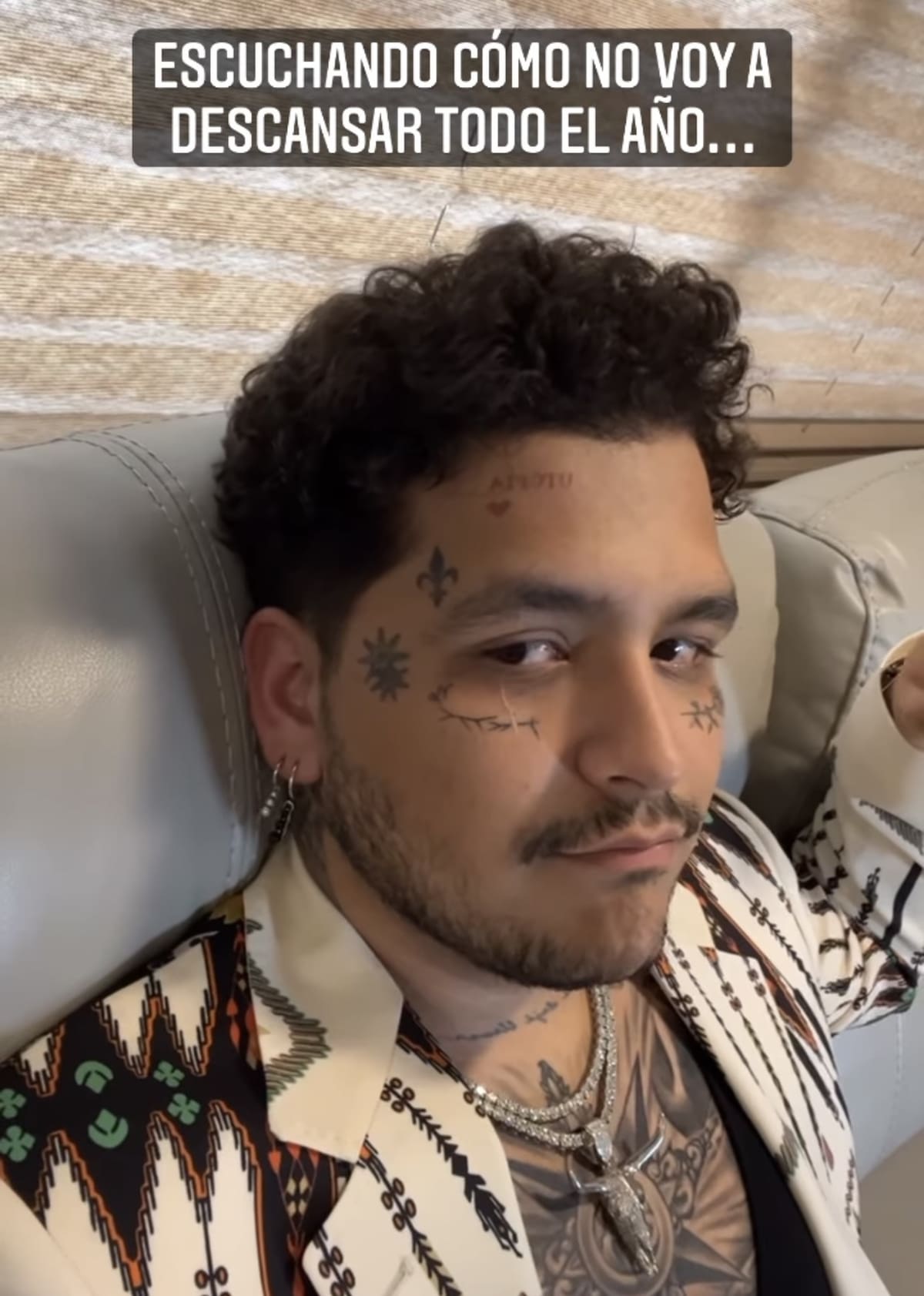 "Escuchando como no voy a descansar todo el año", escribió Christian Nodal en el video mientras se le ve un poco triste. Luego voltea la cámara y dice: "Me retiro. Me retiro ya", como broma ante la cantidad de trabajo que le planean para este año.
