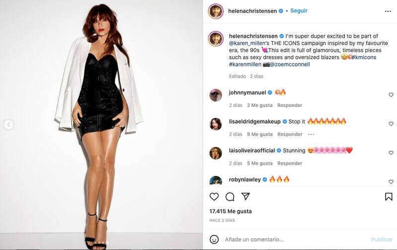 En su cuenta de Instagram, la modelo de ascendencia danesa escribió: “Estoy súper emocionada de ser parte de la campaña THE ICONS de @karen_millen inspirada en mi época favorita, los años 90. Esta edición está llena de piezas glamorosas y atemporales, como vestidos sexys y blazers de gran tamaño”, acompañando la publicación con cuatro imágenes en las que luce outfits espectaculares.