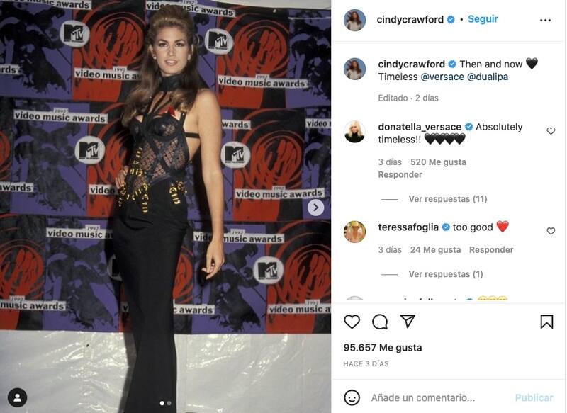 Cindy Crawford, de 56 años, quien apareció en el desfile de Off-White en febrero, fue homenajeada por Dua Lipa, quien vistió un conjunto Versace en los Grammy idéntico al que usó Crawford en una premiación de MTV en 1992.