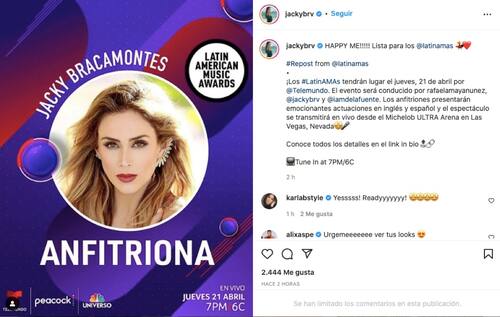 Escribió en su cuenta de Instagram: "¡Los #LatinAMAs tendrán lugar el jueves 21 de abril por @Telemundo. El evento será conducido por rafaelamayanunez, @jackybrv y @iamdelafuente. Los anfitriones presentarán emocionantes actuaciones en inglés y español y el espectáculo se transmitirá en vivo desde el Michelob ULTRA Arena en Las Vegas, Nevada".