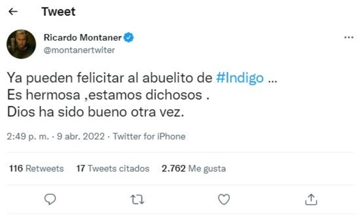 El orgulloso padre de Evaluna, Ricardo Montaner utilizó su cuenta de Twitter para celebrar la llegada de su nieta, luego de que durante los últimos días con algunas publicaciones desmintiera la versión que circuló sobre el nacimiento de Índigo.