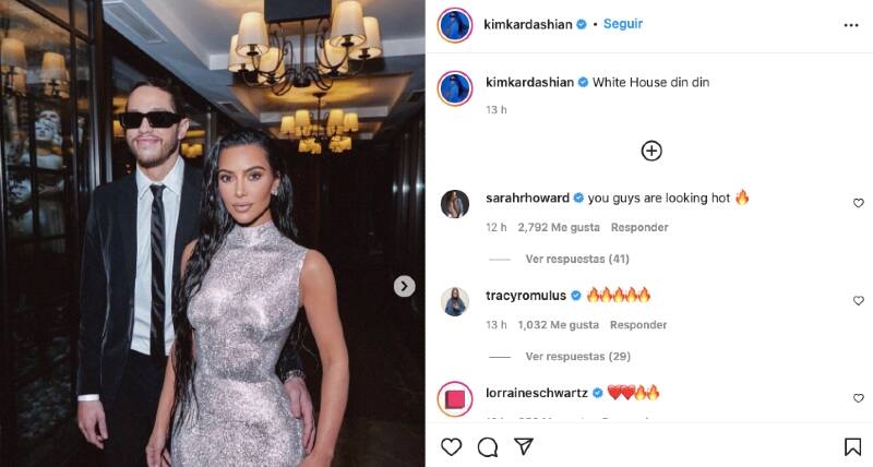 La pareja se detuvo para posar para los fotógrafos. Kim subió una serie de siete imágenes de su look y su traslado hacia la cena en su cuenta de Instagram, únicamente acompañando la galería con el mensaje "White House din din".