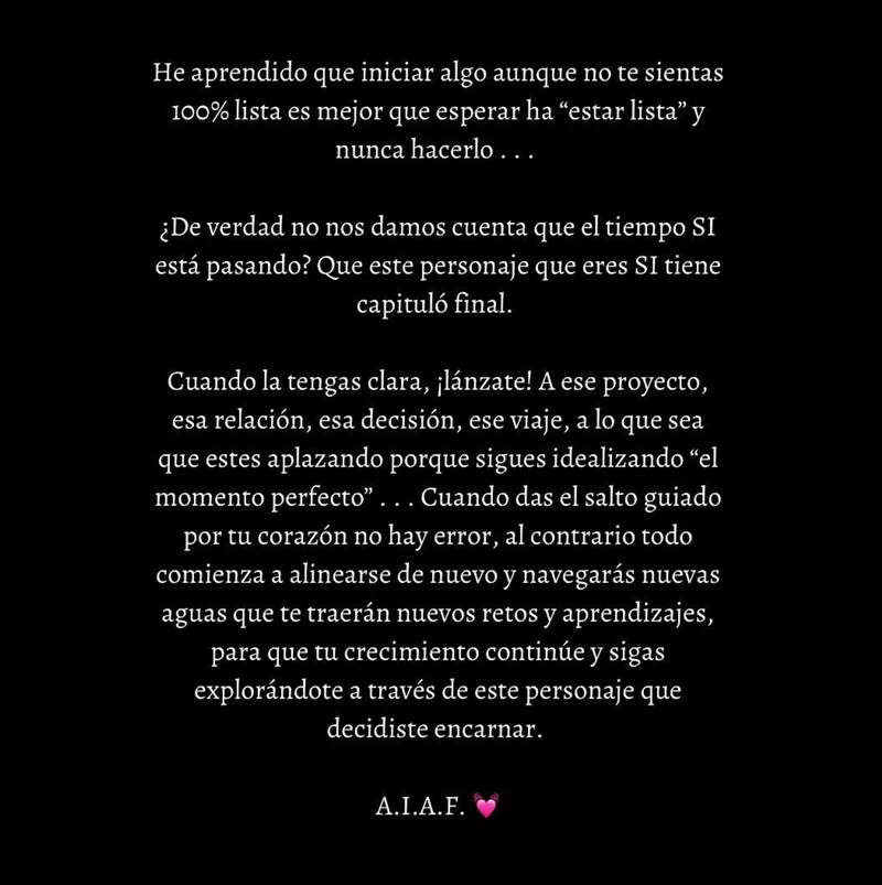 “La vida no es una línea recta, no hay una meta al final, lo que vives en el inter entre que naces y mueres eso es la vida, no hay más. Al final de todo no hay nada, ^realmente estás viviendo para ti? Confía”, escribió junto a otro texto escrito sobre una imagen.