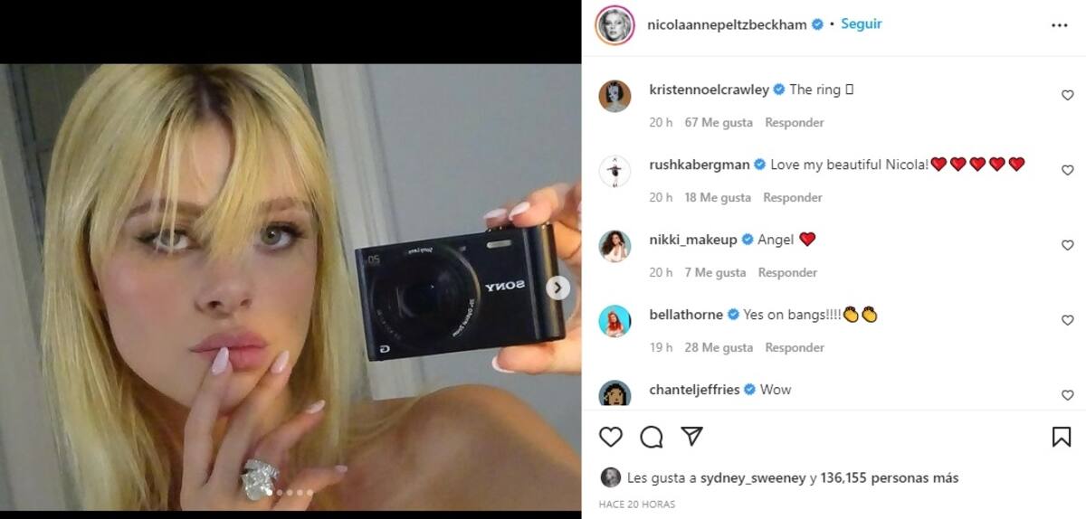 Según aseguró a Page Six la presidenta de Platinum Guild International USA, Jenny Luker, "el nuevo anillo de Nicola Peltz parece presentar un diamante ovalado muy grande, de aproximadamente 6 a 8 quilates, con diamantes trapezoidales a los lados, todo engastado en una banda de platino brillante".
