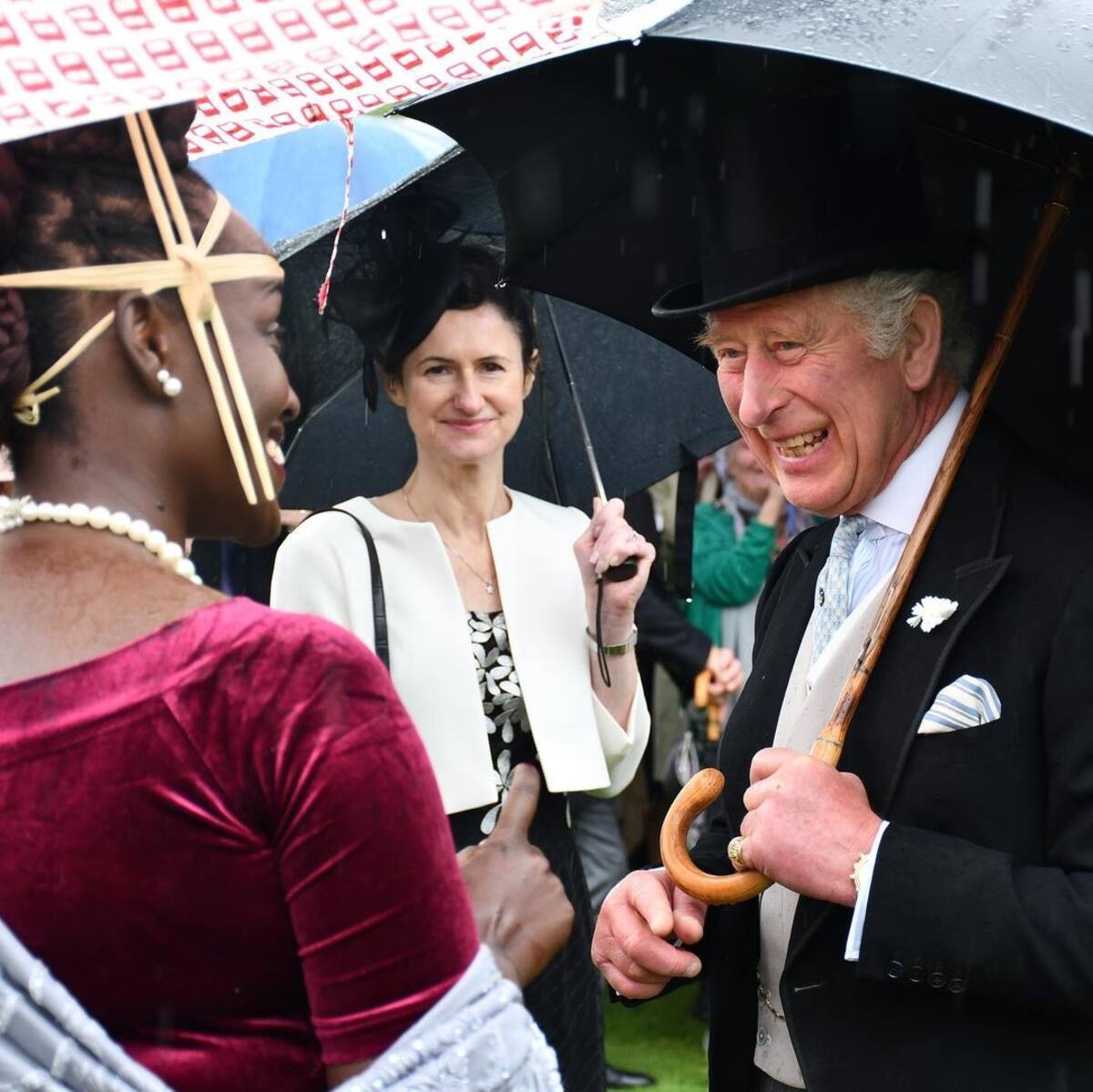 Camilla y la princesa Ana llevaron sombrillas abiertas y el príncipe Carlos usó el paraguas como bastón y lo abrió cuando comenzó a llover. Otros miembros de la realeza que asistieron fueron el duque de Kent, así como el príncipe y la princesa Michael de Kent.