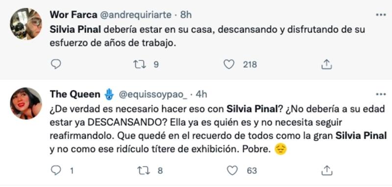 Y estas no se debieron a la actuación de Silvia Pinal, quien se mostró desorientada, a quien se le olvidaron sus diálogos y que apareció postrada en sus tres escenas. Las críticas más bien apuntaron a sus hijos, que permiten que la Diva del Cine Mexicano aparezca en este estado.