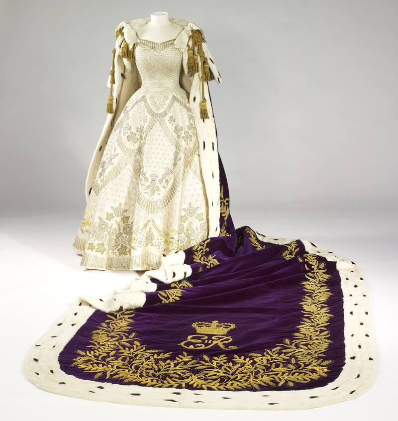 En el Castillo de Windsor, el majestuoso vestido de coronación de la reina diseñado por Norman Hartnell y su túnica de terciopelo de seda púrpura se mostrarán junto con cinco broches que representan los emblemas de la Commonwealth.