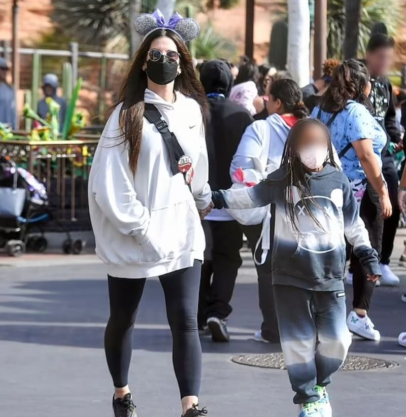 La actriz paseó por Disneyland aparentemente sin seguridad y optó por un look deportivo compuesto por sudadera Nike con capucha blanca, mallas de entrenamiento negra y tenis a juego con calcetines bajos.