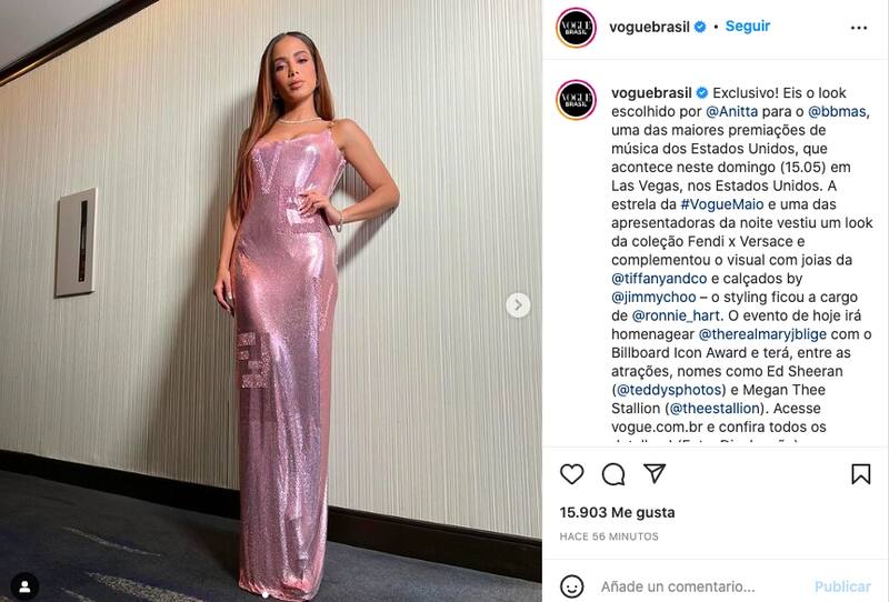 La cantante es portada de la edición brasileña de mayo de "Vogue". A la entrega de premios, Anitta, quien fue una de las headliners del Festival Coachella, llegó en un vestido rosado brillante.