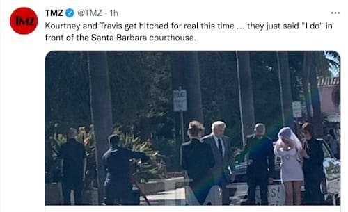 De acuerdo con información de TMZ, se vio a la pareja vestida en lo que el imaginario colectivo corresponde a un look de boda en el juzgado del centro de Anacapa. Los acompañaban la abuela de Kourtney, Mary Jo "MJ" Campbell, y el padre de Barker, Randy, quienes estaban de pie a su lado.