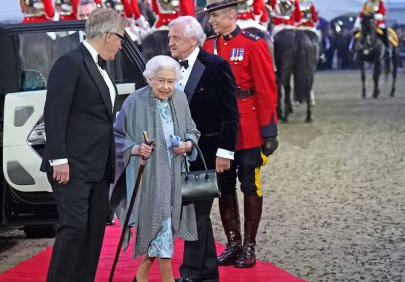 Auxiliada por dos oficiales de la Household Cavalry, la reina fue vitoreada por la multitud. Llegó para ver "A Gallop through History", evento con el que se marcó el inicio de los festejos por su Jubileo Platino y con el que se cerró el Royal Windsor Horse Show, al que ya había asistido el viernes.