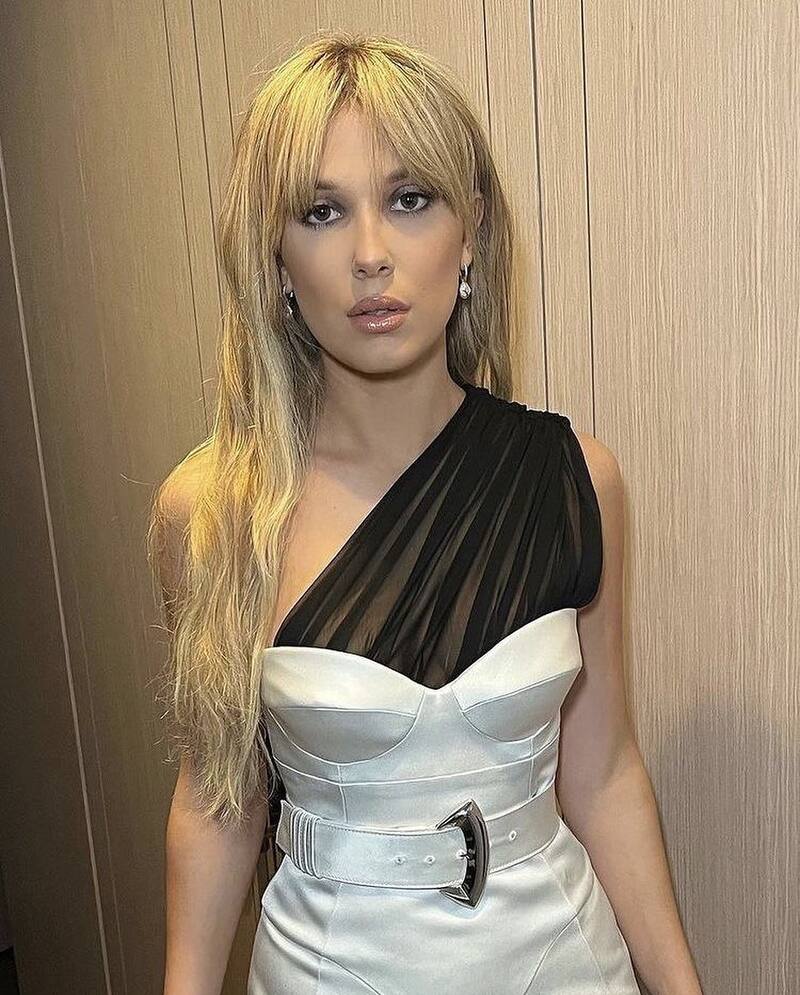 Millie Bobby Brown sorprendió al aparecer con una nueva tonalidad de pelo, dejando atrás el castaño para apostar por el dorado (ya antes se le había visto en el programa de Jimmy Fallon) con un flequillo recto abierto por la mitad.