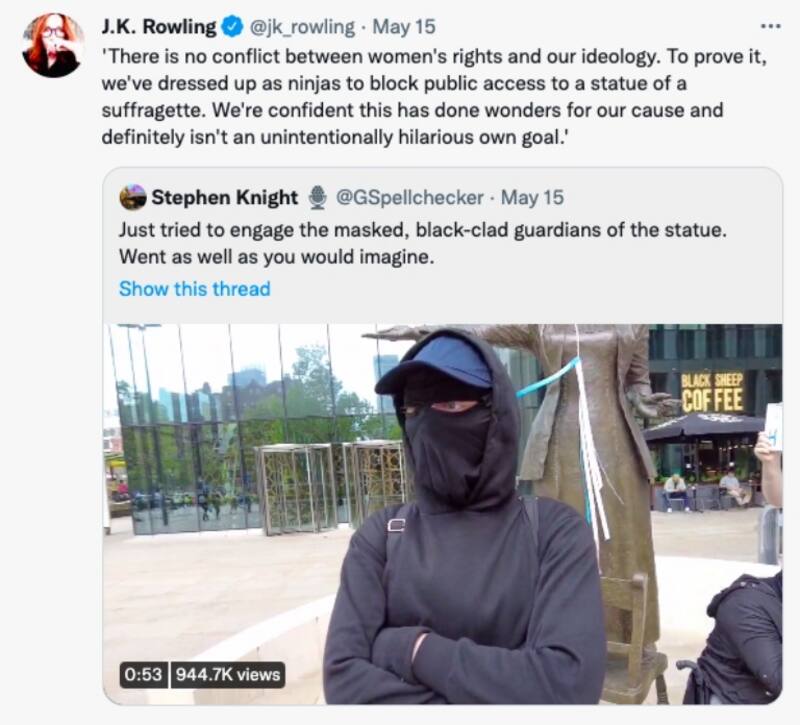 J. K. Rowling, autora de la saga de libros "Harry Potter", quien es considerada transfóbica por los comentarios que ha emitido en su cuenta oficial de Twitter, criticó al grupo de personas encapuchadas y citó el mensaje de los activistas.