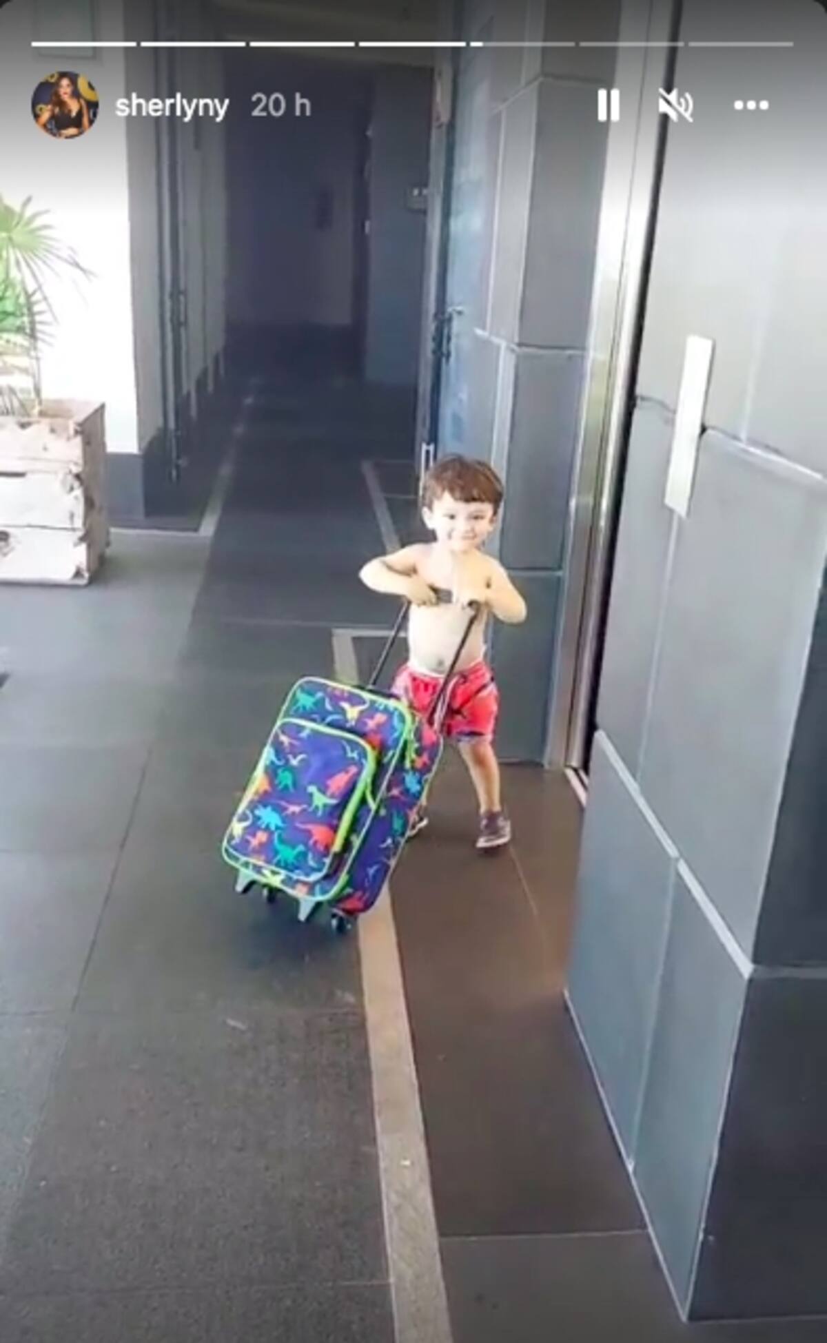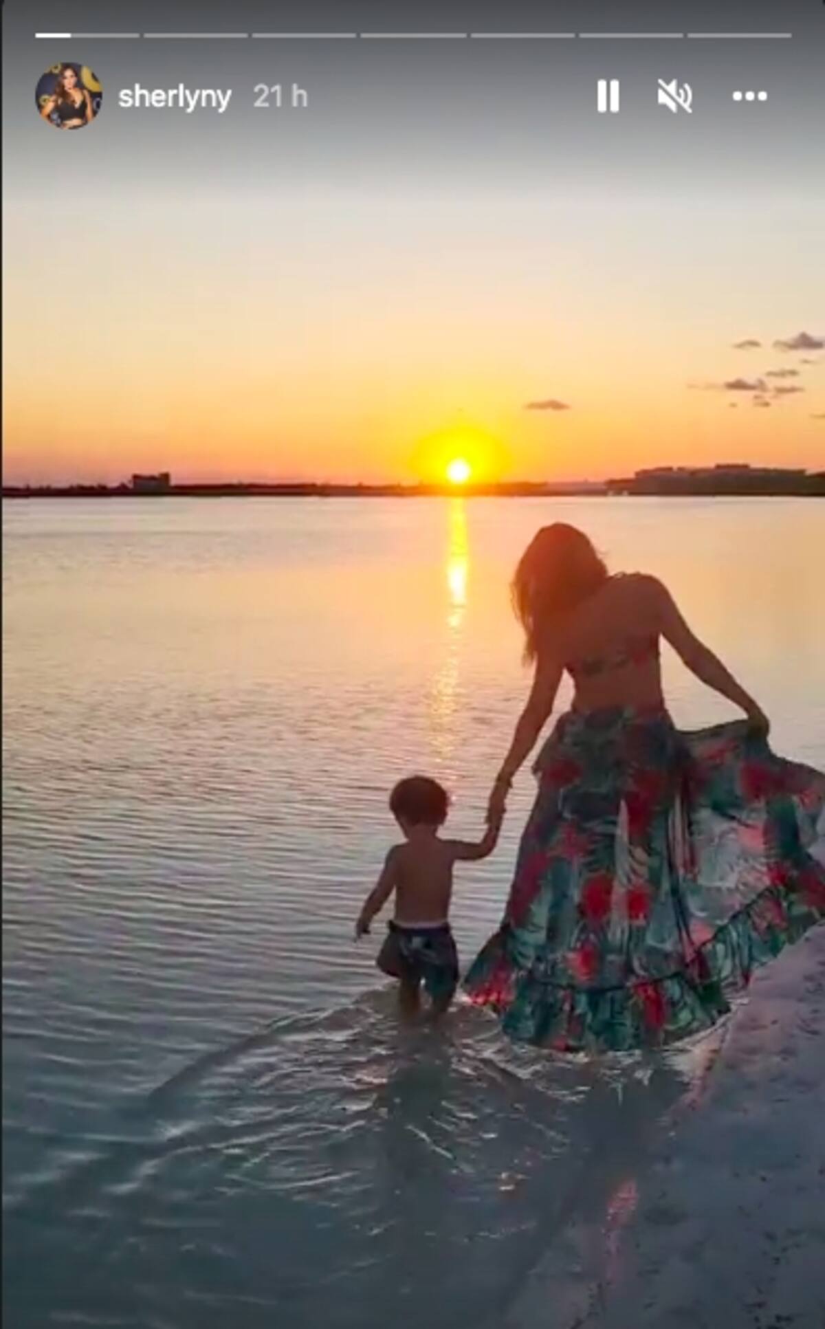 Así lo compartió en sus historias de Instagram donde vemos a la feliz mamá con su hijo caminando en la arena a la orilla del mar. Causó mucha ternura ver que combinaron sus trajes de baño. Sherlyn con un traje de dos piezas cubierta con falda larga y vaporosa en tonos verdes y estampado de hojas mientras que André usó un pequeño short con la misma tela.