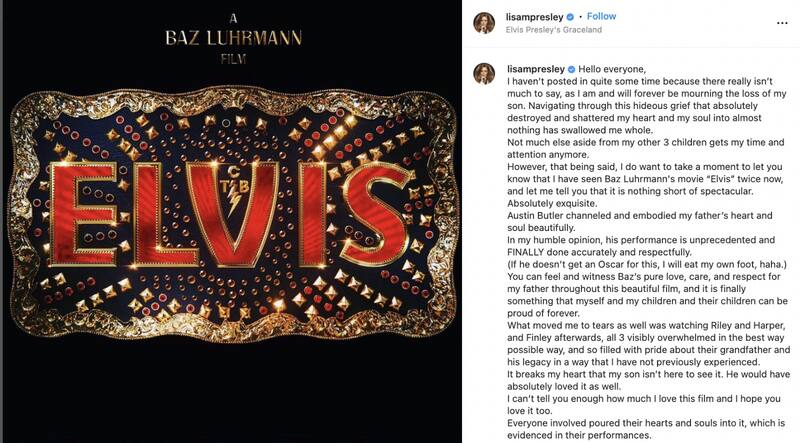 "Austin Butler canalizó y encarnó maravillosamente el corazón y el alma de mi padre. En mi humilde opinión, su actuación no tiene precedentes y FINALMENTE se realiza con precisión y respeto", agrega en el escrito la hija de Elvis.