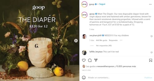 "The Diapér" es un producto falso, una campaña destinada a exponer “la ridiculez de gravar los pañales como un producto de lujo”, explicaba también Goop en una nota de prensa enviada a Vice. “Nunca tuve que pensar en el coste de los pañales, ni una sola vez, hasta hace poco, cuando mi equipo en Goop lo mencionó”, reflexionaba Paltrow en la nota de su compañía.