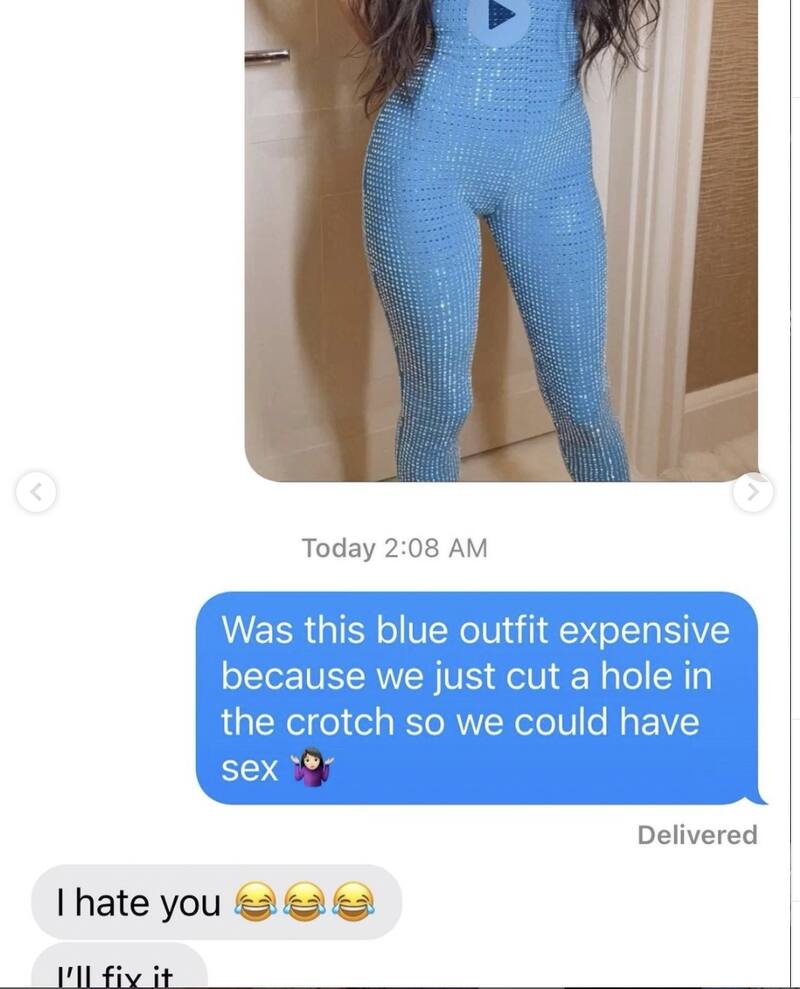 "¿Era este atuendo azul caro porque acabamos de hacer un agujero en la entrepierna para poder tener sexo?". A lo que su colaborador escribió: "Te odio" junto con tres emojis risueños, antes de agregar: "Lo arreglaré".