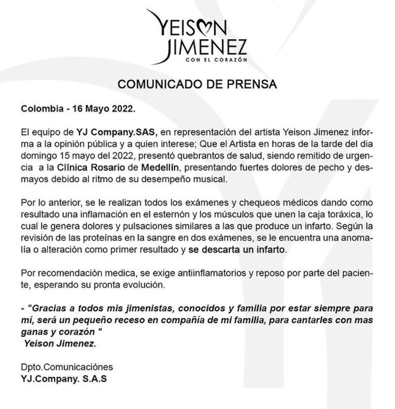 Conoce el comunicado de prensa sobre el estado de salud de Yeison Jiménez