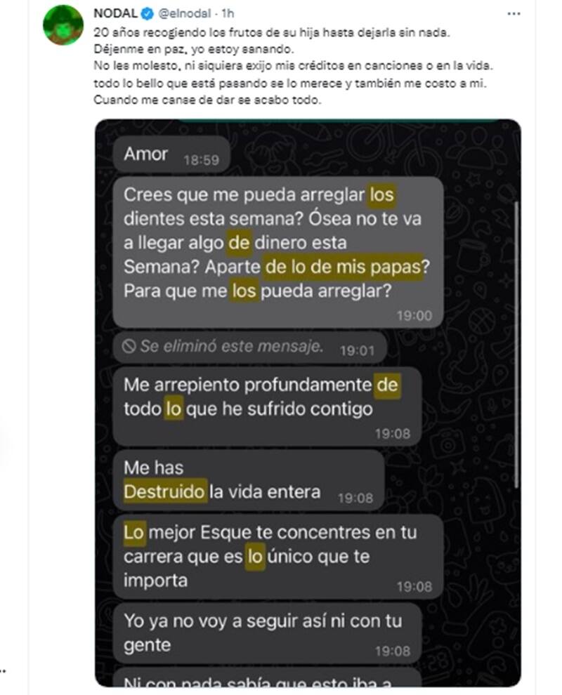 Esta versión tomaría fuerza este miércoles 18 de mayo después de que Christian Nodal compartiera una fotografía en su cuenta en Twitter en la que destapó una plática íntima junto a su presunta ex pareja sentimental, desatando un sin fin de especulaciones.