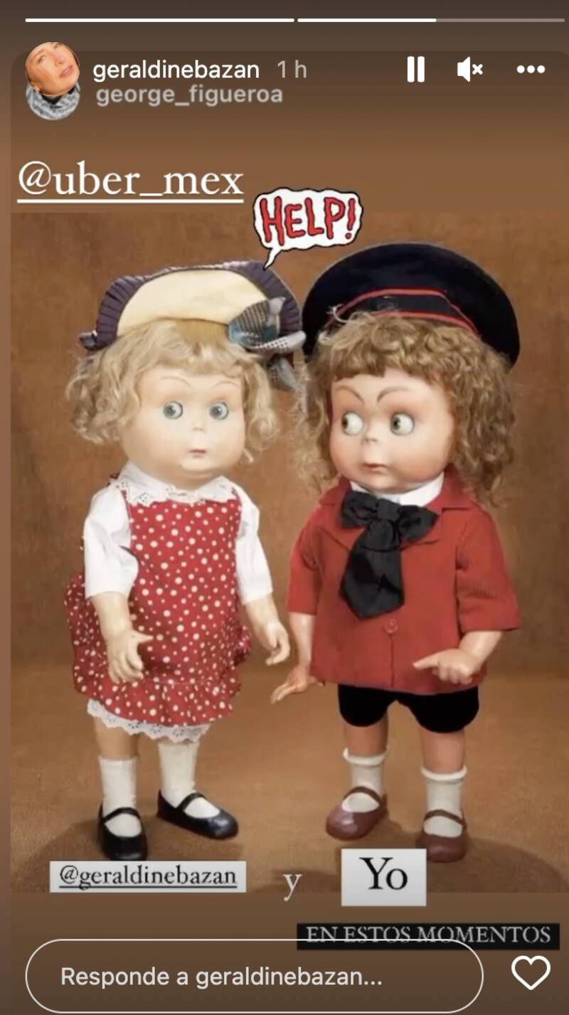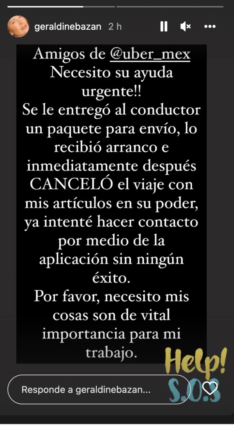 "Amigos de Uber necesito su ayuda urgente. Se le entregó al conductor un paquete para envío, lo recibió, arrancó e inmediatamente después canceló el viaje con mis artículos en su poder", comenzó a escribir Geraldine en su historia de Instagram.