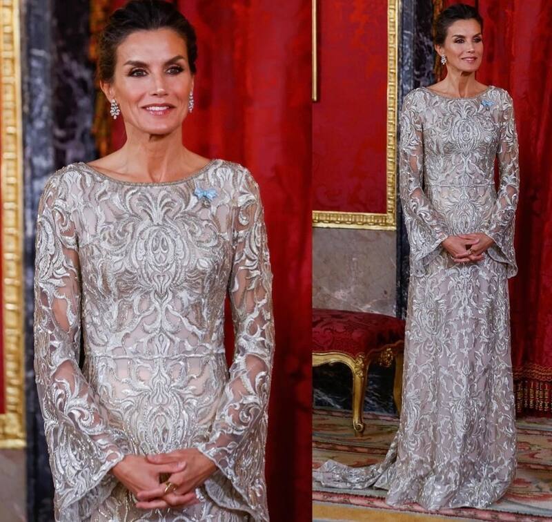 En cuanto al "outfit", la reina deslumbró con un elaborado vestido largo de tul en color champaña con bordados y cristales, mangas acampanadas y cola, del diseñador argentino Gabriel Lage.