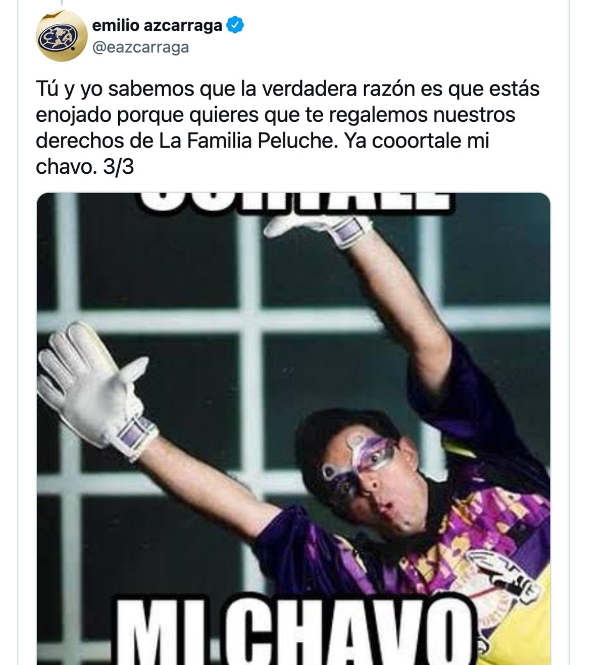 Finalmente, terminó tachando al mexicano de mentiroso rematando con un “tú y yo sabemos que la verdadera razón es que estás enojado porque quieres que te regalemos nuestros derechos de La Familia Peluche. Ya coártale mi chavo”.