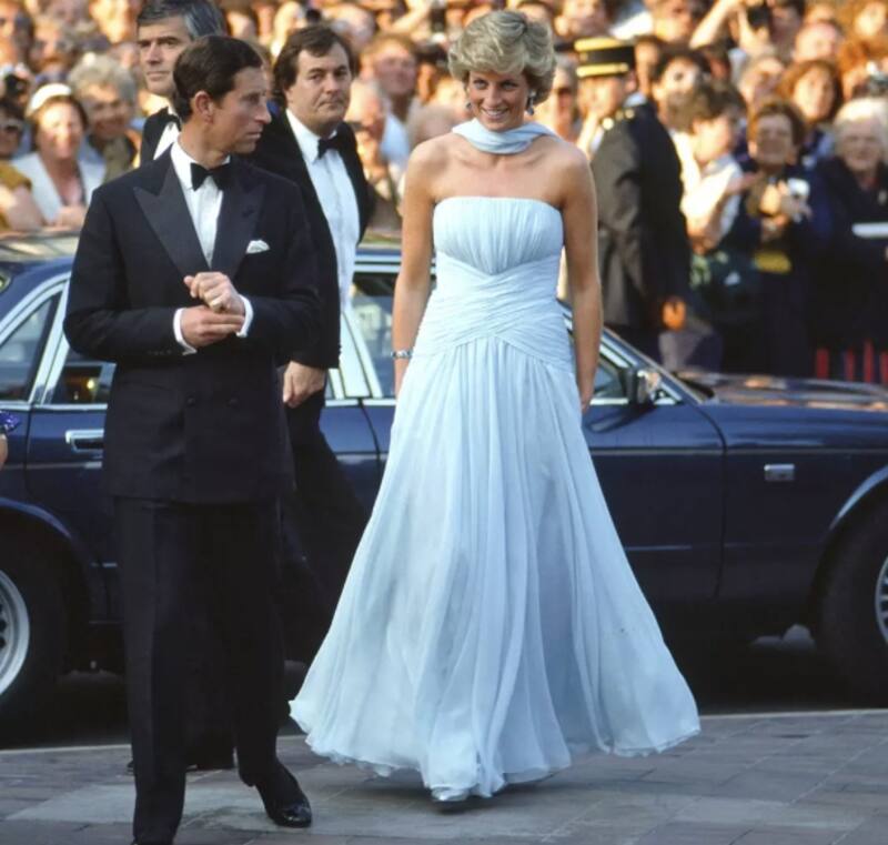 La princesa Diana caminó por la alfombra roja del Festival de Cine de Cannes cuando tenía 26 años, asistiendo a una noche de gala en honor al actor, Sir Alec Guinness, junto al príncipe Carlos. Lady Di cautivó con un vestido sin tirantes azul claro combinado con una bufanda a juego que fluía detrás de ella, un atuendo de su colaboradora frecuente Catherine Walker.