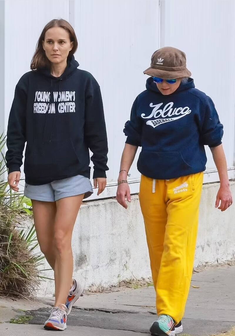 Portman llevaba una sudadera con capucha negra de Young Women's Freedom Center, que combinó con un pequeño conjunto de shorts grises que resaltaban sus piernas tonificadas y tenis Nike grises, con rojo y azul.
