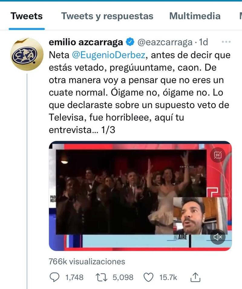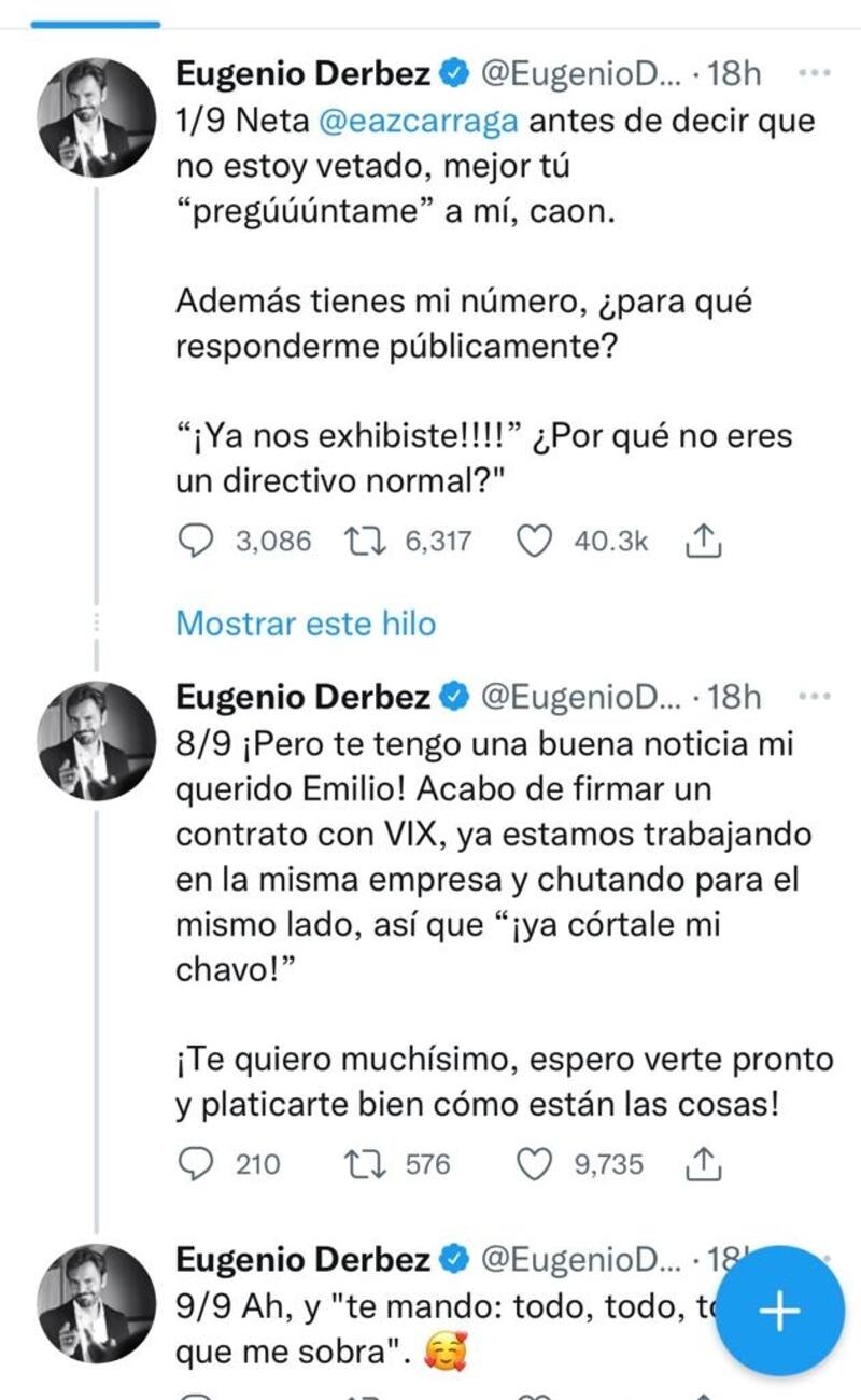 "Neto Eugenio Derbez, antes de decir que estás vetado, pregúntame, caon. Lo que declaraste sobre un supuesto veto de Televisa fue horrible, aquí tu entrevista. Tú y yo sabemos que la verdadera razón es que estás enojado porque quieres que te regalemos nuestros derechos de la Familia Peluche. Ya córtale mi chavo", escribió en su red social Emilio Azcárraga, el viernes 20 de mayo.