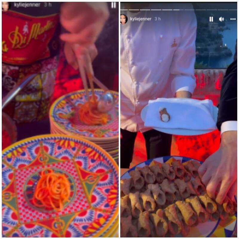 A través de sus historias de Instagram, Kylie compartió varios videos en los que se aprecia que están rellenado cannoli, el dulce más famoso de Italia, asimismo se ve que se está preparando al momento el spaguetti y lo sirven en porciones pequeñas en platos muy coloridos.