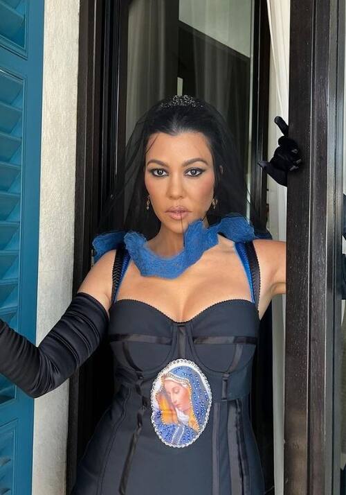 Al centro del vestido resalta una imagen de la Virgen María, pues al parecer optó por usar un elemento similar al que utilizó su hermana Kim en su vestido de boda con Kanye West.