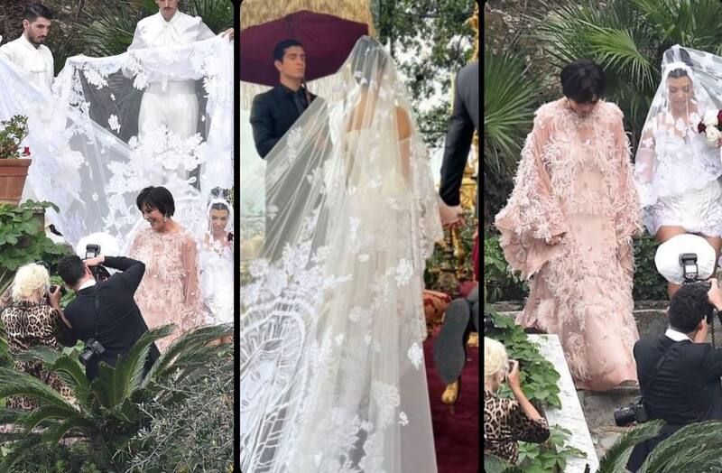 Para esta ocasión, la mayor de las Kardashian vistió un mini vestido de encaje blanco, guantes transparentes y un impresionante velo largo de encaje que robó la mirada de los asistentes, pues tenía impresa una imagen sacra de la Virgen María.