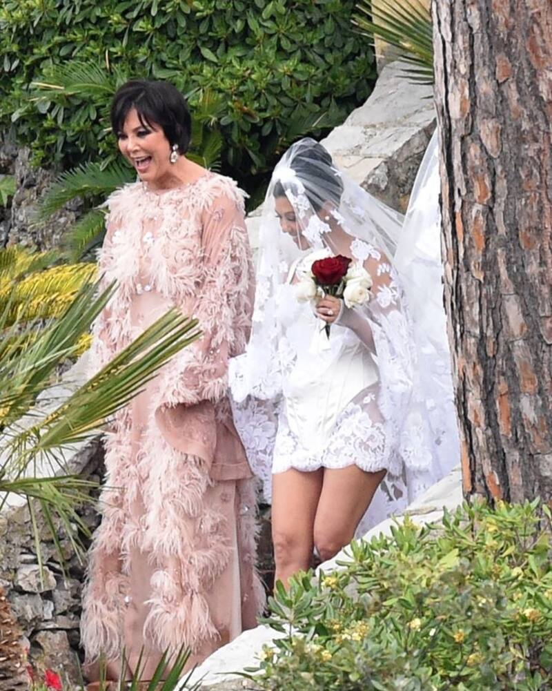 Acompañada de Kriss Jenner, Kourtney llegó al altar sosteniendo un ramo de rosas rojas para jurarse amor eterno a Travis Barker una vez más, luego de dos bodas pasadas.