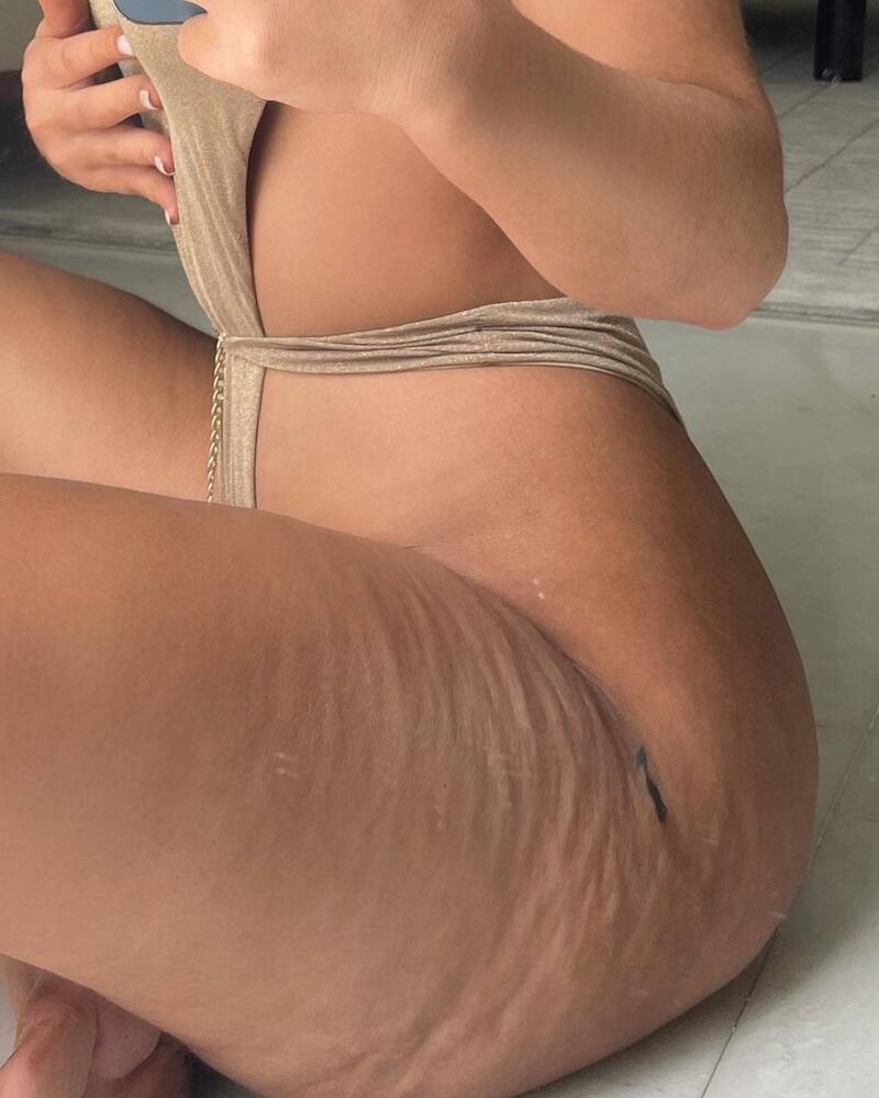 En otra imagen, se encuentra sentada con las piernas cruzadas y se aprecia con mayor detalle el estado de su piel en la zona de la cadera.