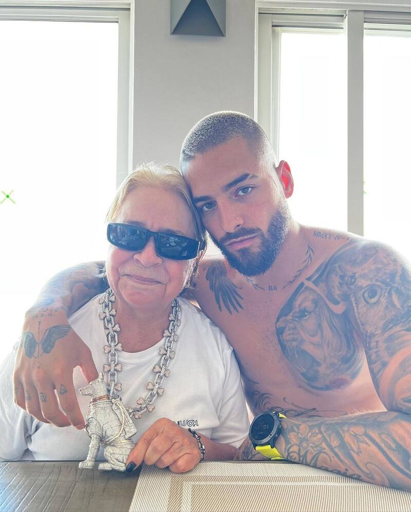 En la primer fotografía vemos a Maluma posar en una selfie con su abuela usando lentes obscuros y un enorme collar de diamantes que fabricó inspirado en su perro.