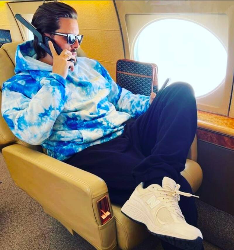 El día de la boda de Kourtney Kardashian, Scott Disick publicó una fotografía viajando en un avión y presumiendo el costoso reloj que acababa de obtener de la exclusiva joyería "Pristine" lleno de diamantes. En sus historias compartió que estaba a bordo de un avión sin decir el destino. Más tarde mostró que había llegado a la playa.