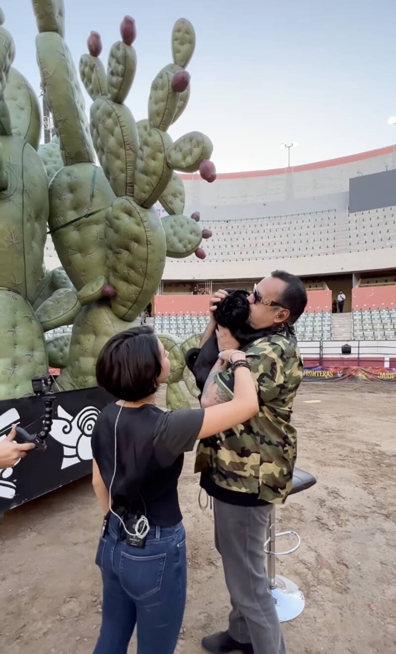 Fue en este momento del concierto que Pepe Aguilar decidió subir en sus brazos a su hijo consentido, el cual fue recibido por Leo y Ángela Aguilar quienes no dudaron en darle abrazos y besos al amado canino.
