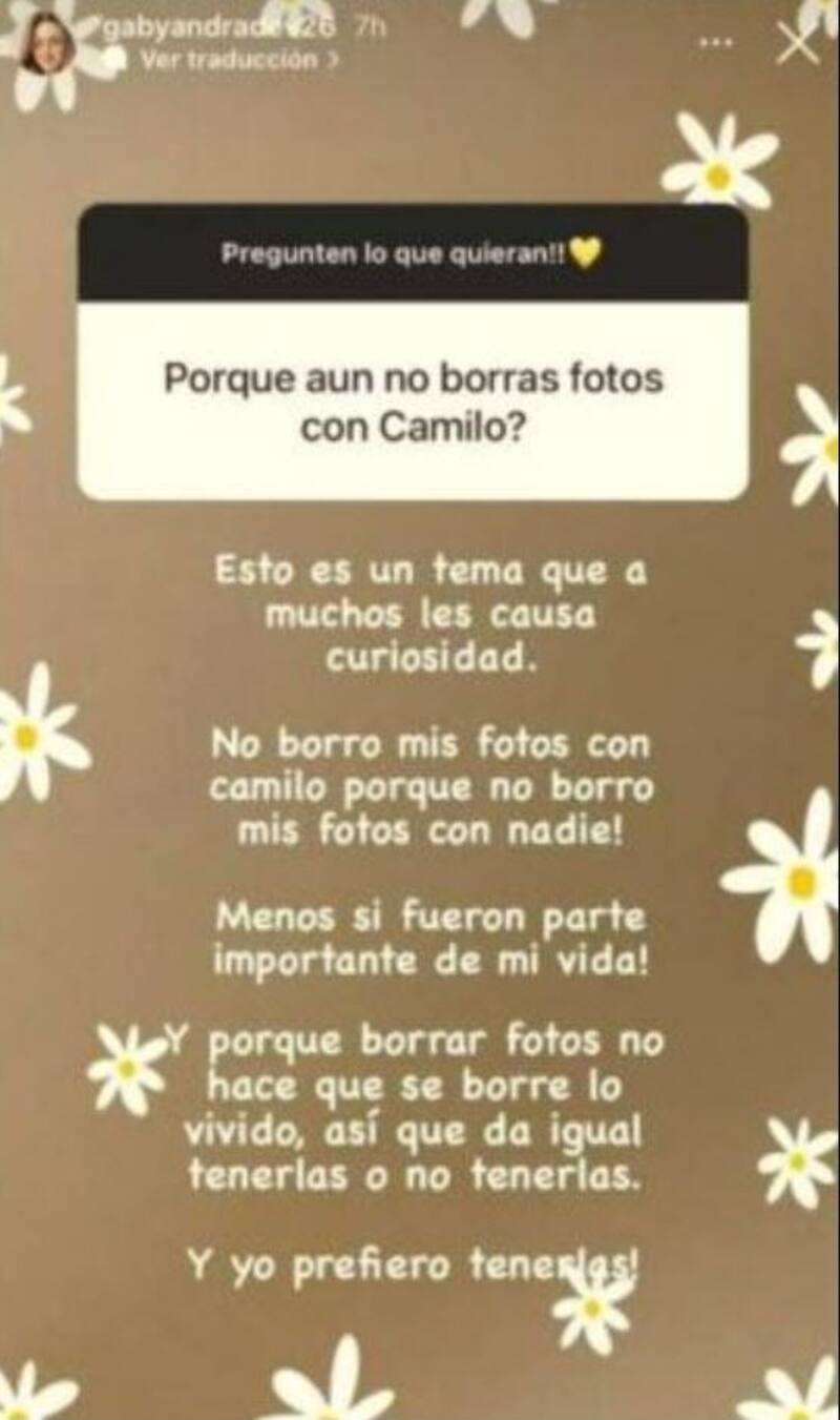 En ese sentido, recientemente en una dinámica de preguntas y respuestas, Gabriela contestó a sus seguidores que le preguntaron de manera insistente por qué se niega a borrar de su cuenta de Instagram las fotos que tiene con Camilo de cuando eran novios.