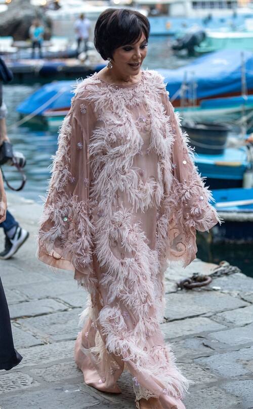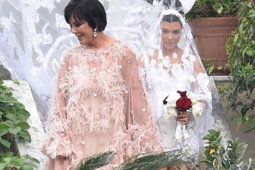 Mamá Kris Jenner en la boda de inspiración gótica, lució un vestido rosa con detalles de plumas y sin duda conmovió a los asistentes cuando se limpió sus lágrimas al acompañar a su hija mayor en la ceremonia de su boda.