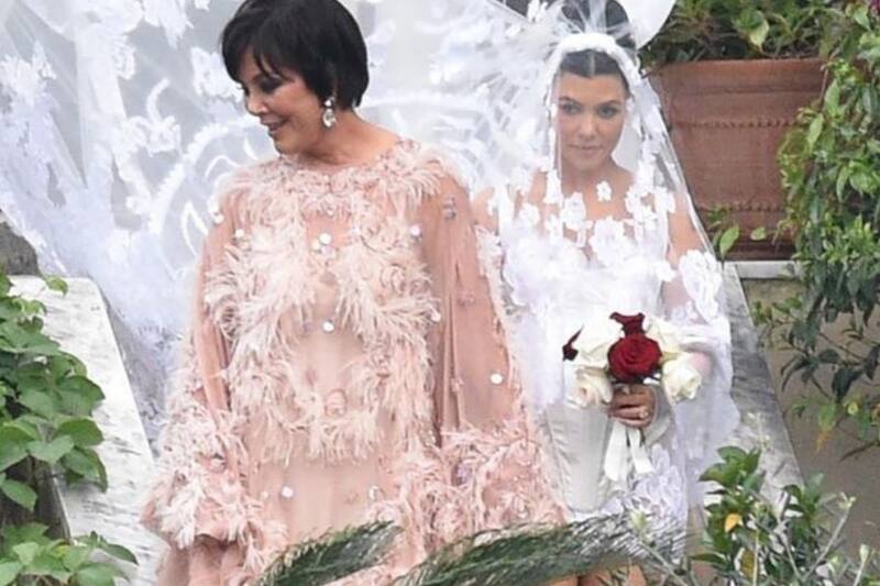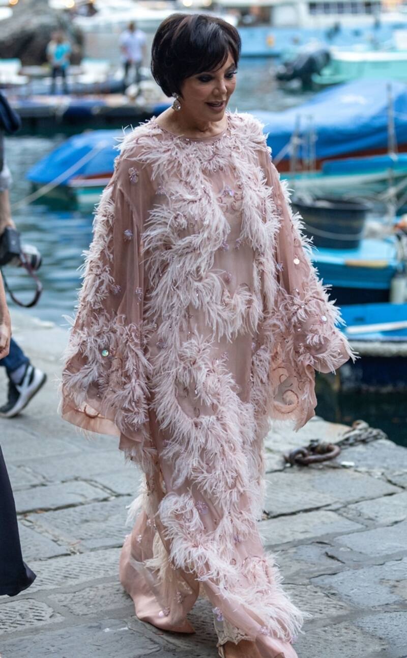 Mamá Kris Jenner en la boda de inspiración gótica, lució un vestido rosa con detalles de plumas y sin duda conmovió a los asistentes cuando se limpió sus lágrimas al acompañar a su hija mayor en la ceremonia de su boda.