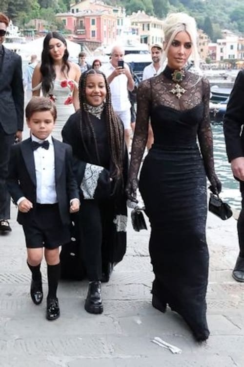 La hermana de Kourtney, Kim Kardashian, deslumbró con un vestido negro de cuello alto que se ajustaba a la figura con detalles transparentes en las mangas. Combinó el vestido de Dolce Gabbana con un espectacular collar con una cruz dorada, tacones negros y un pequeño bolso negro.
