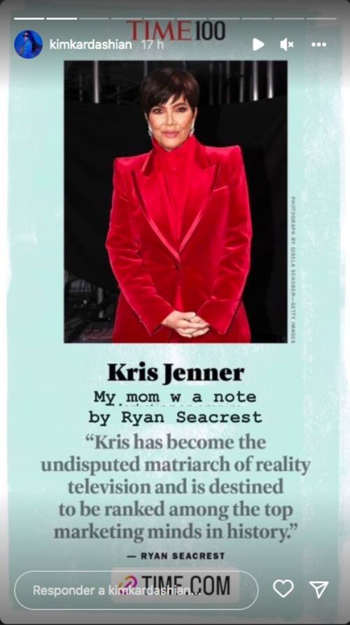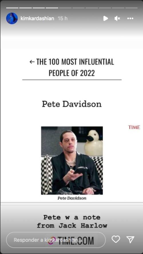 Después que su mamá, Kris Jenner, y su novio, Pete Davidson, fueron nombrados en la lista de las 100 personas más influyentes del 2022, Kim Kardashian lo publicó orgullosa en sus historias de Instagram.