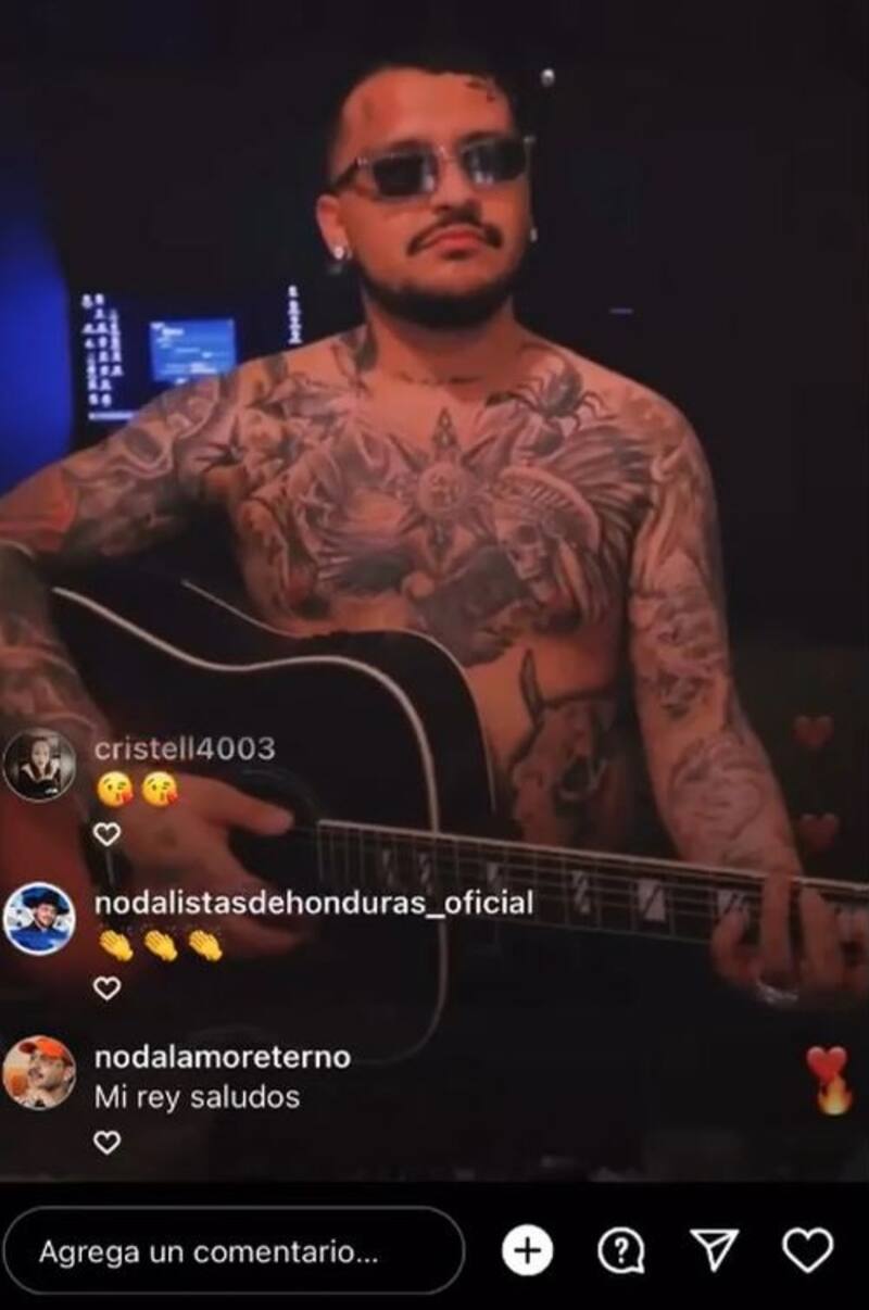 En el enlace en vivo, la estrella del regional mexicano como pocas veces apareció sin playera tocando la guitarra, por lo que sus seguidores de inmediato se percataron que los ojos de Belinda habían desaparecido de su pecho y efectivamente los cubrió con varios diseños.