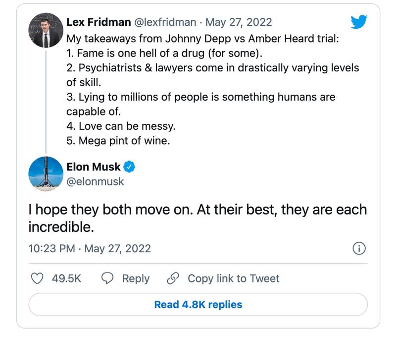 Lex Fridman tuiteó lo siguiente el 27 de mayo: “Mis conclusiones del juicio entre Johnny Depp y Amber Heard son: 1. La fama es una buena droga. 2. Los psiquiatras y abogados tienen muchos niveles de conocimientos. 3. Mentirle a millones de personas es algo que algunos humanos pueden hacer. 4. El amor es un desastre. 5. Una mega pinta de vino”.