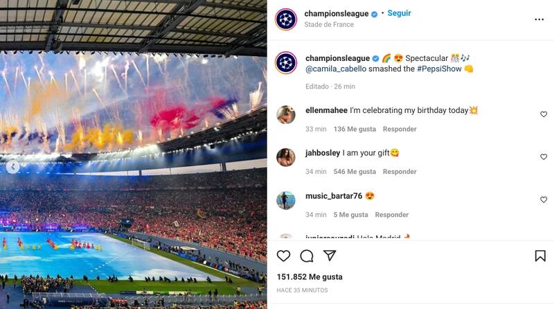 Camila Cabello protagonizó el espectáculo de apertura de la final de la Champions League que se celebra esta tarde en París, Francia. La cantante de ascendencia cubana dio un breve pero espectacular show que inició con media hora de retraso debido a problemas con aficionados ingleses que quisieron entrar ilegalmente al Stade de France.