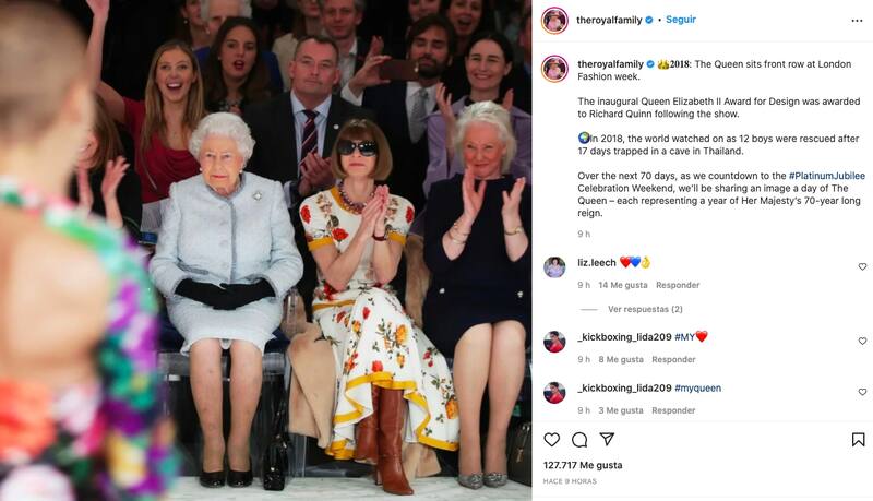 La foto de hoy, correspondiente a 2018, muestra a la monarca en primera fila durante la Semana de la Moda de Londres. "El primer premio Queen Elizabeth II Award for Design fue otorgado a Richard Quinn después del espectáculo".