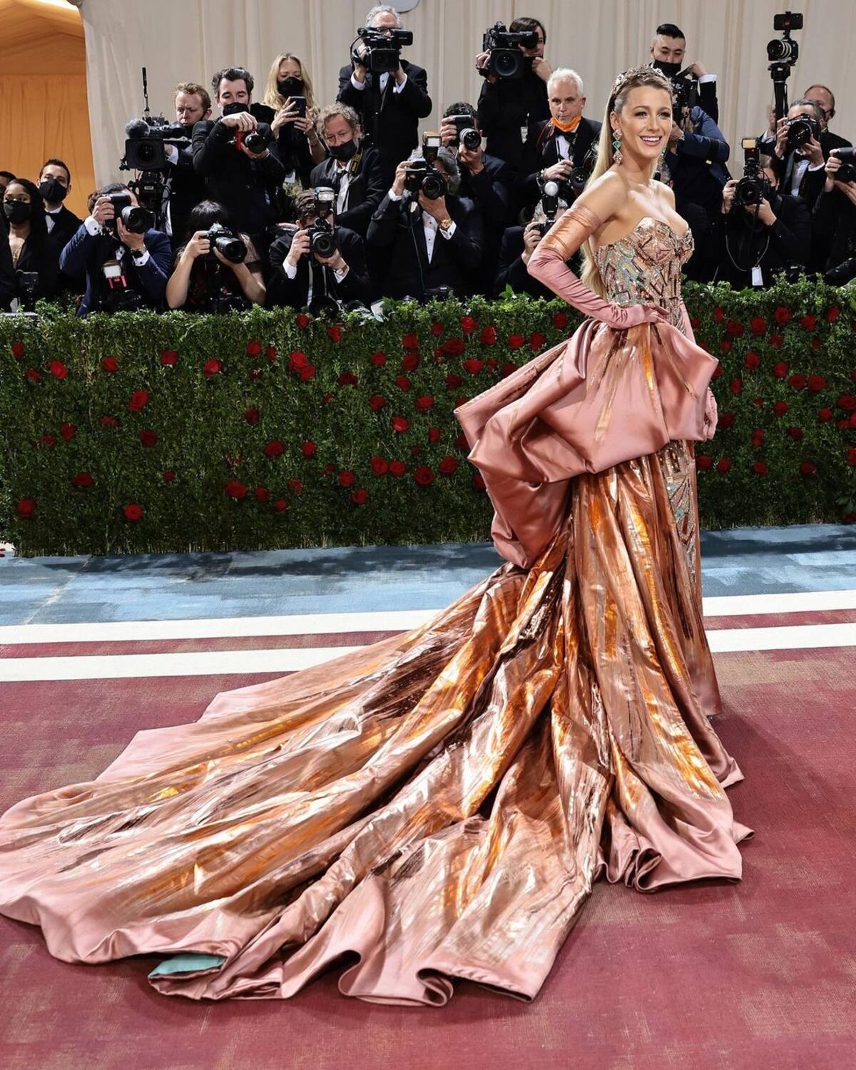 La anfitriona de la MET, celebró la arquitectura neoyorquina. "Al llegar a la alfombra roja con un vestido columna de tul personalizado de AtelierVersace bordado con cristal, cuero metalizado, paillette y lámina de cobre tritono duchesse, se deshizo un gran lazo en la cintura para revelar un segundo look en cardenillo, que refleja la transformación de la Estatua de la Libertad de Nueva York de bronce a verde oxidado. El largo tren duchesse presenta un mapa celestial bordado, laminado y pintado a mano inspirado en las 12 constelaciones del zodiaco que decoran el techo de Grand Central Station. La forma original del vestido se inspira en el diseñador estadounidense Charles James, mientras que las formas art déco recuerdan los lugares emblemáticos de Nueva York, como el edificio Empire State", explica Atelier Versace.