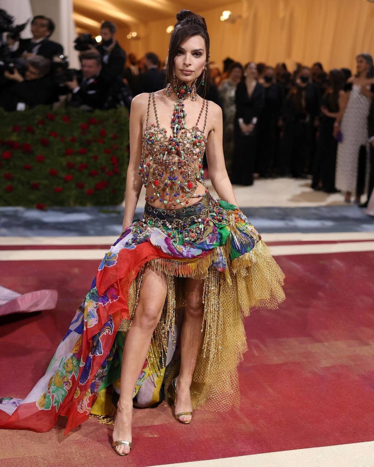 La modelo estadounidense, autora del best selle "My Body", eligió un modelo del archivo Versace de 1992: "un corpiño de metal adornado con hojas barrocas y detalles de piedras de resina multicolor. La falda con estampado floral y geométrico está confeccionada en georgette con tul dorado y flecos de pedrería".