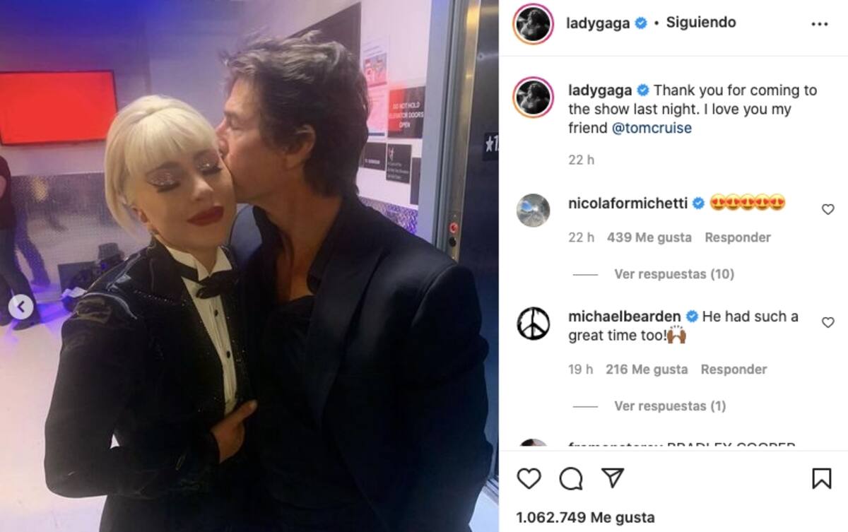 "Gracias por venir a mi show anoche", agradeció Lady Gaga en su cuenta de Instagram a Tom. "Te quiero mi amigo @tomcruise", acompañando el mensaje con un par de fotografías en las que se abrazan amistosamente.